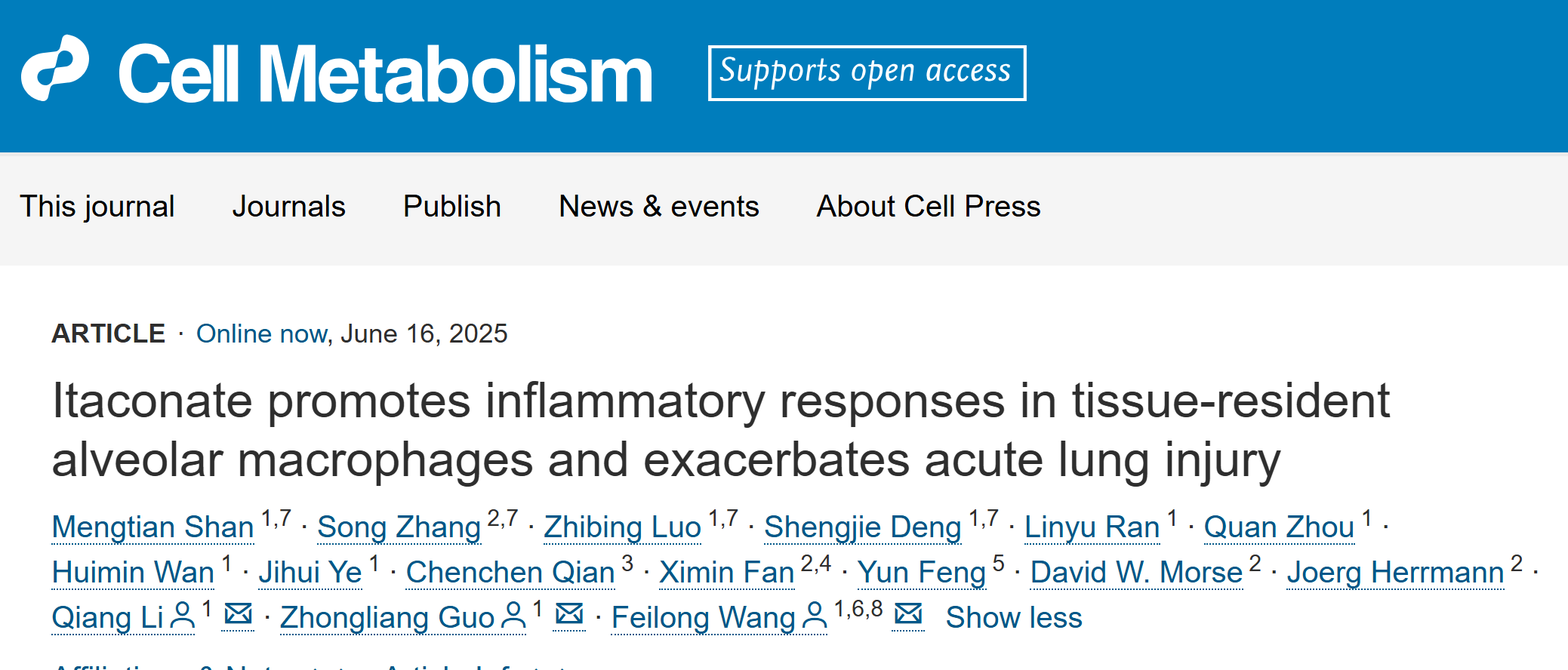 王飞龙、李强、郭忠良团队在Cell Metabolism杂志揭示衣康酸促进肺泡巨噬细胞介导的炎症反应