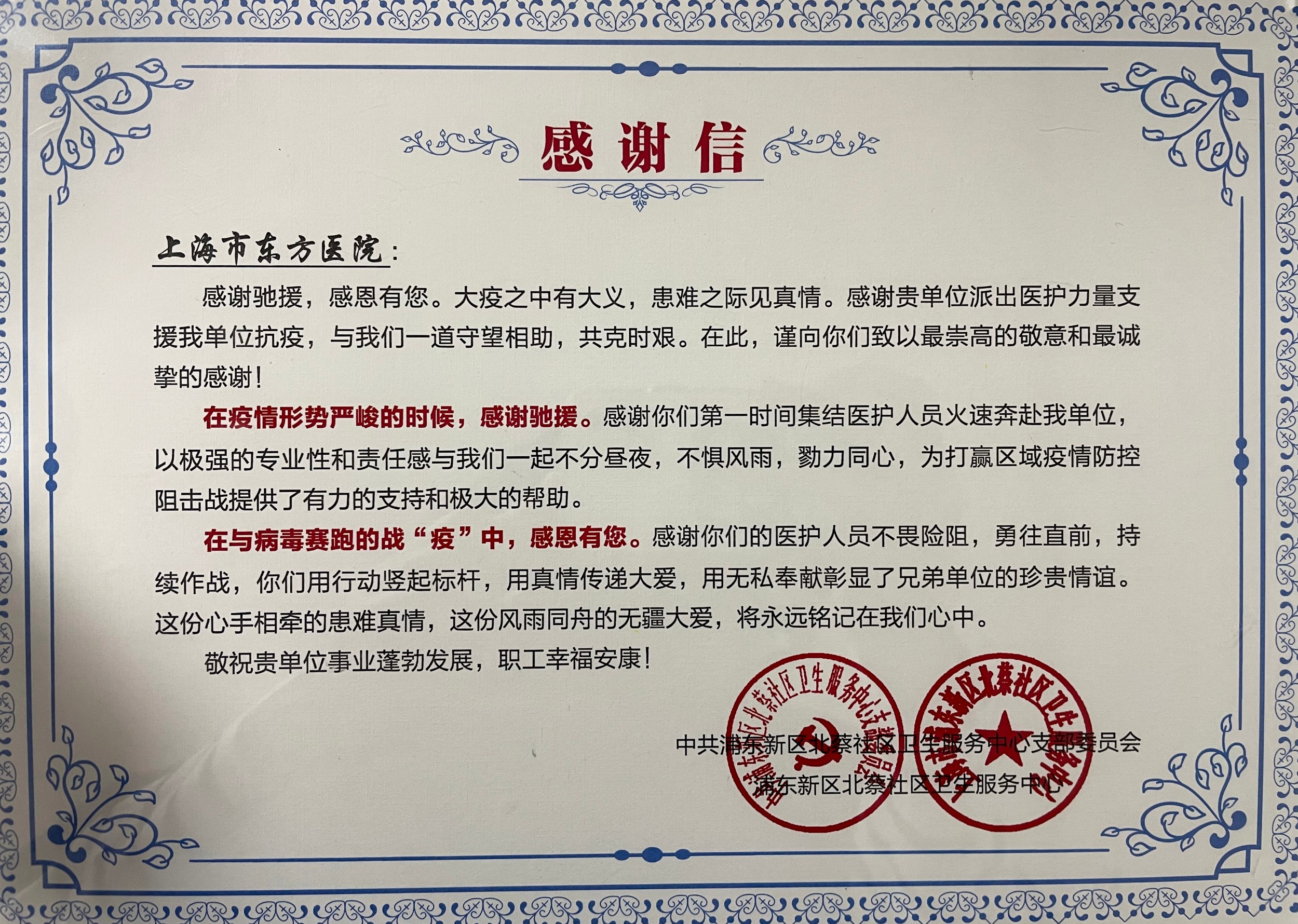 一封来自中共浦东新区北蔡社区卫生服务中心支部委员会和浦东新区北蔡社区卫生服务中心的感谢信