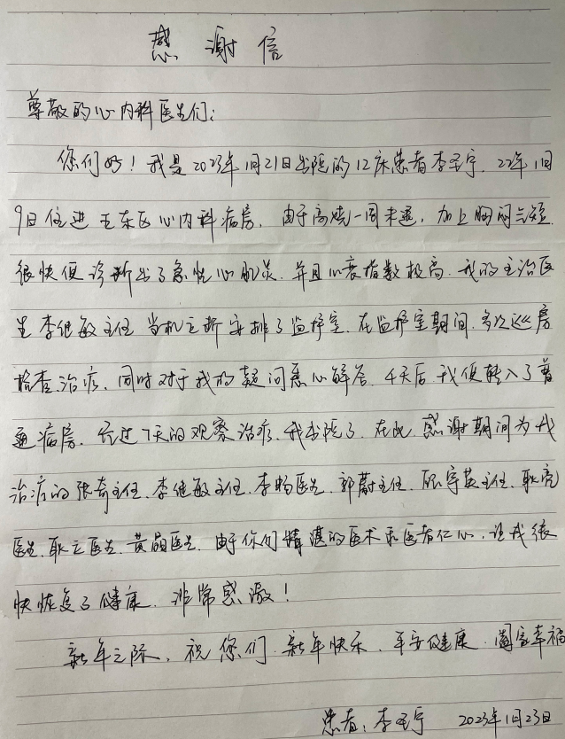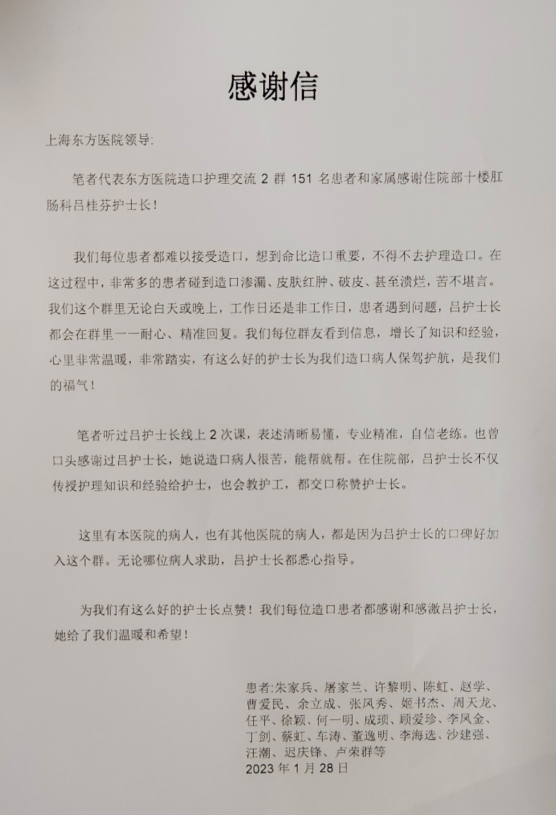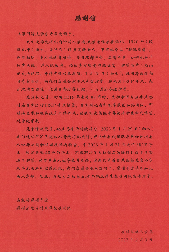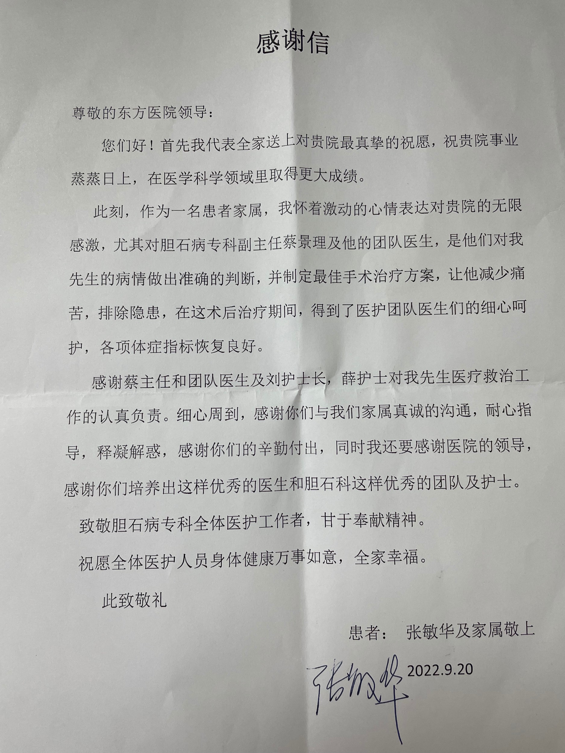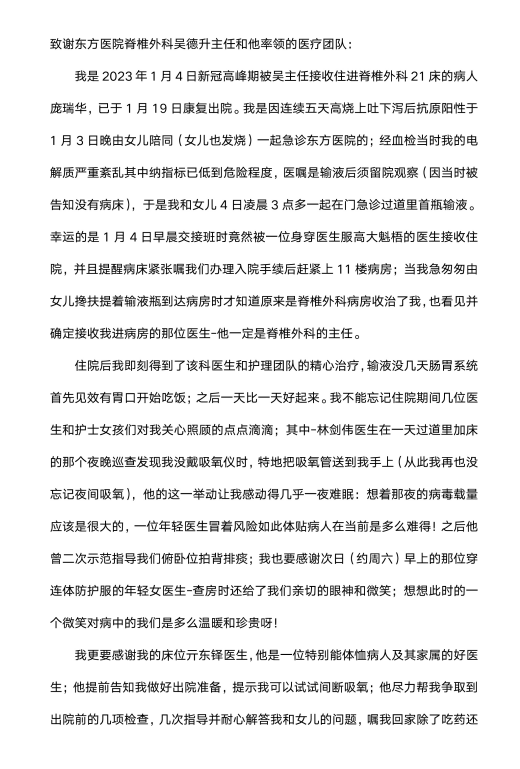 致东方医院脊柱外科吴德升主任及团队的感谢信