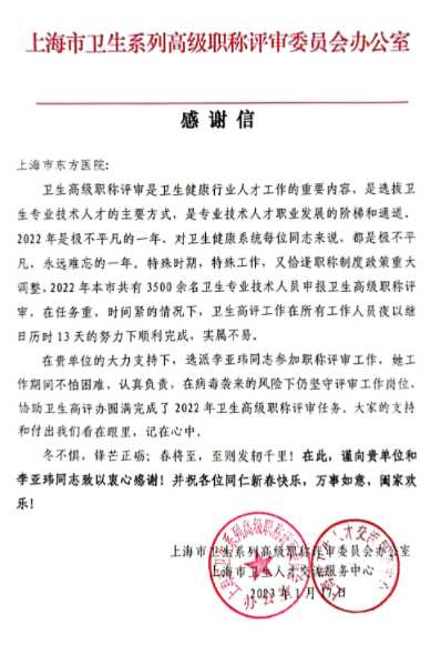 上海市卫生系列高级职称评审委员会办公室的感谢信