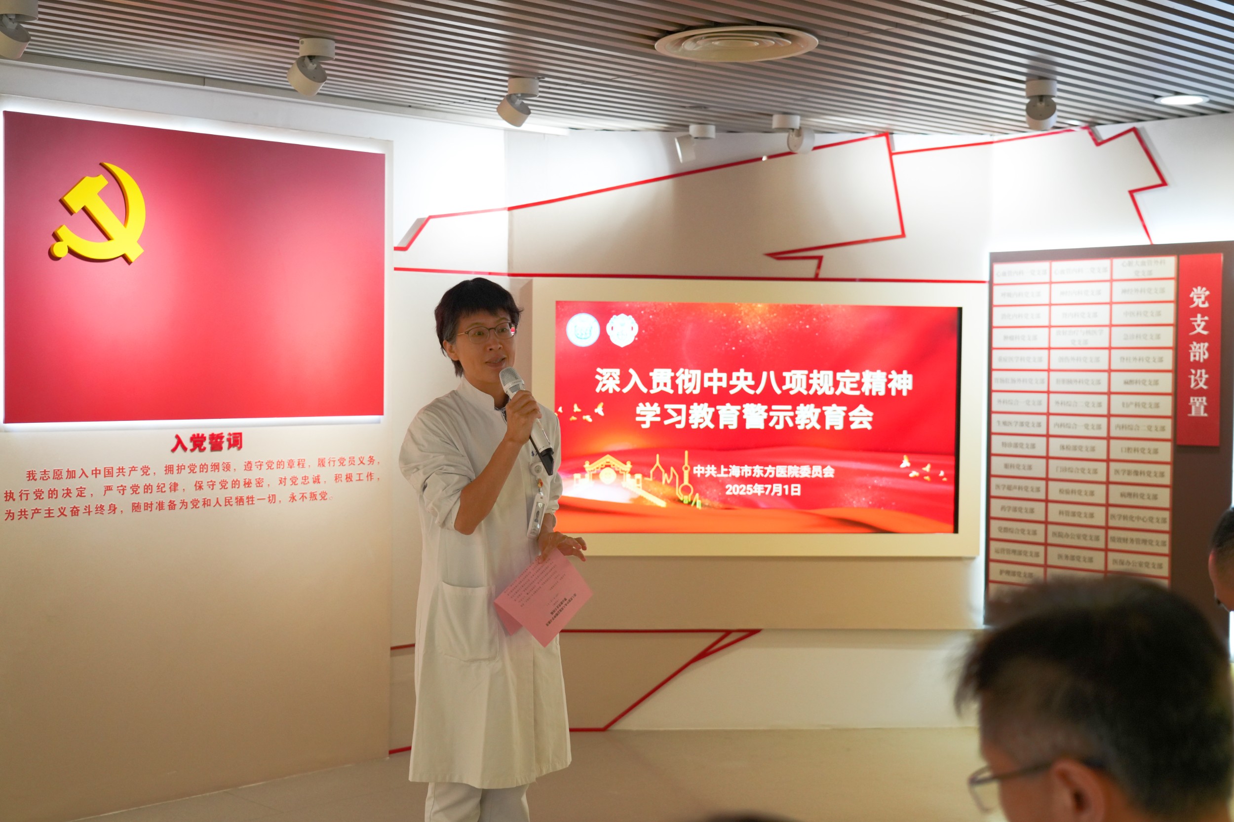 7月1日下午,值中国共产党成立104周年之际,上海市东方医院党委于医院党建文化阵地召开“深入贯彻中央八项规定精神学习教育警示教育会”。医院党政班子成员、党委委员、党支部书记及委员、年轻干部等100余人参会。会议以专题党课形式,紧扣“深入贯彻中央八项规定精神学习教育”主题,系统学习中央八项规定及其实施细则精神,深入剖析违反中央八项规定精神典型案例。旨在引导全体党员、干部以案为鉴、以学促改,强化纪律意识,筑牢思想防线,始终做到知敬畏、存戒惧、守底线。医院党委副书记、纪委书记李静主持召开会议。