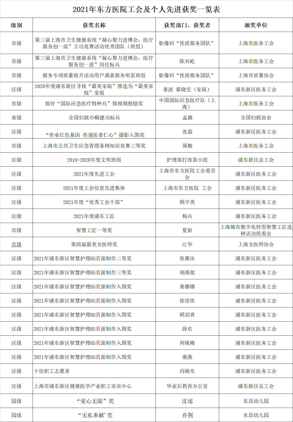 2021年度工会荣誉汇总表